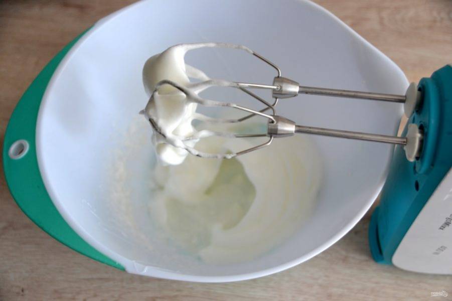 Белки взбейте в пену, добавьте глюкозный сироп (или другой сахарозаменитель), взбейте до стойких пиков.