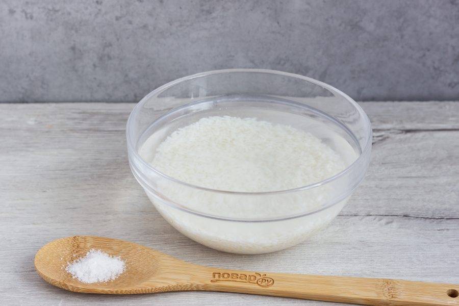 Рис промойте руками, меняя воду 7-8 раз, до прозрачной воды. Если будет необходимость, то больше. Посуду лучше использовать стеклянную, так как крахмал не держится на стенках стекла. Промытый рис в чистой воде убираем в сторону на 1-2 часа. Можно накрыть салфеткой. Как известно, крупа которая предварительно постоит в воде, меньше варится. Это нам и нужно!