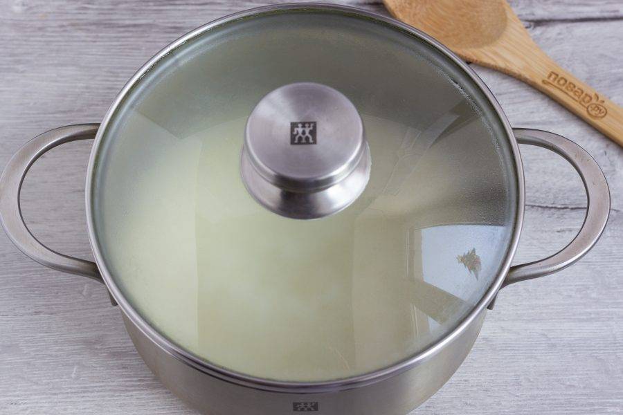 Затем сливаем воду, кладем рис в кастрюлю и заливаем двумя стаканами чистой воды. Ставим на сильный огонь. Доводим до кипения и продолжаем варить на сильном огне 3 минуты.