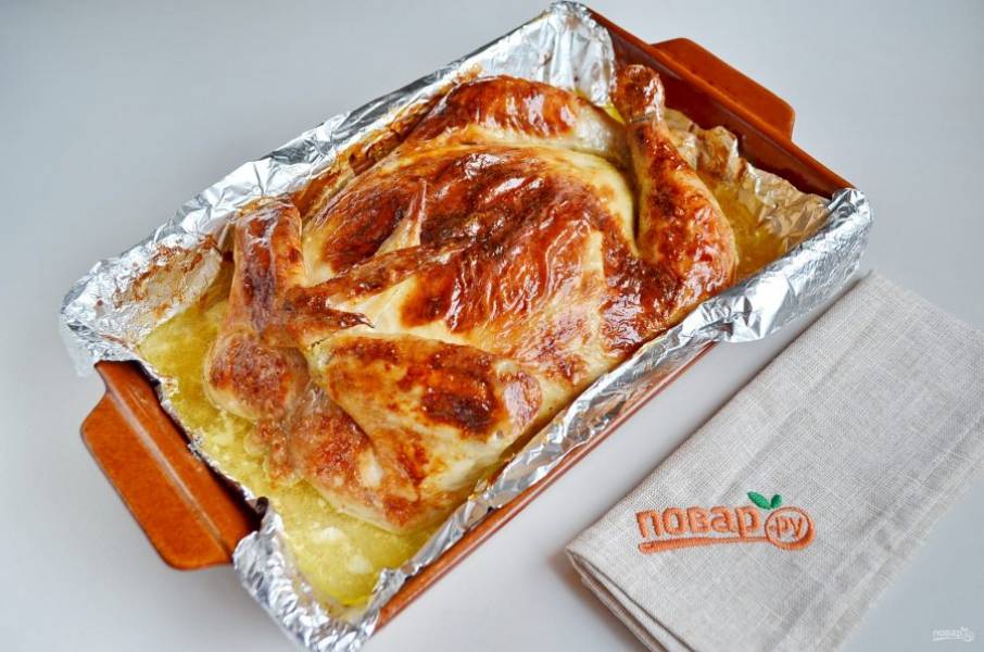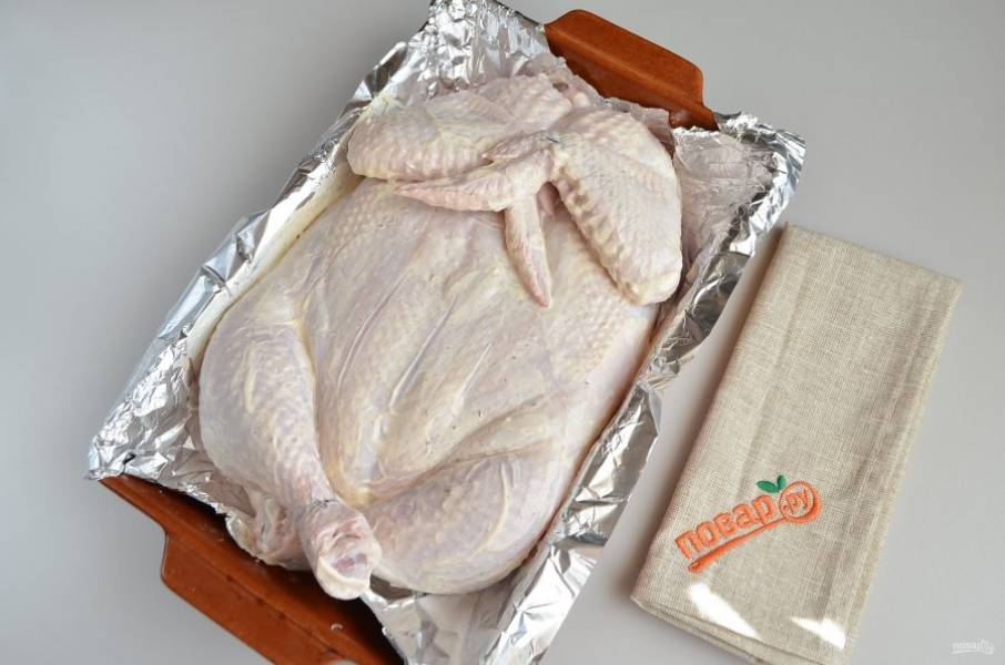 8. Перевяжите ниточкой шею, зашейте брюшко, перевяжите крылышки и ножки. Уложите курицу на фольгу или сразу в смазанную маслом форму. Смажьте сметаной. Можно посыпать любимыми специями.