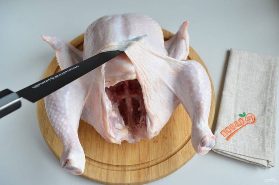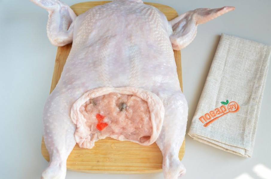 2. Хорошо вымойте тушку. Возьмите острый нож и приступите к снятию кожи с тушки. Делайте это не спеша, осторожно, старайтесь кожу не повредить. Тут можно посмотреть более подробные фото, если вы снимаете кожу впервые: http://povar.ru/recipes/kurica_farshirovannaya_blinami_prazdnichnaya-65934.html.