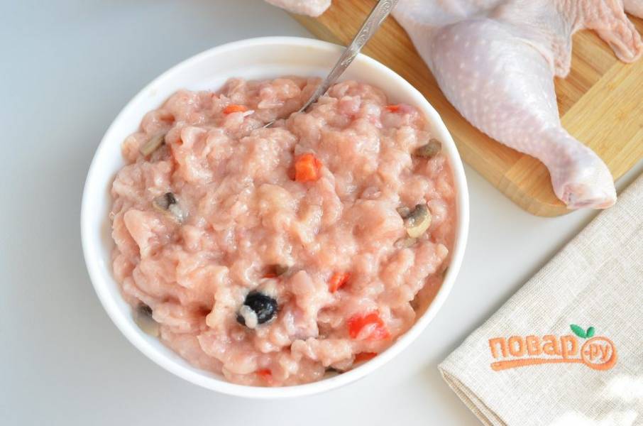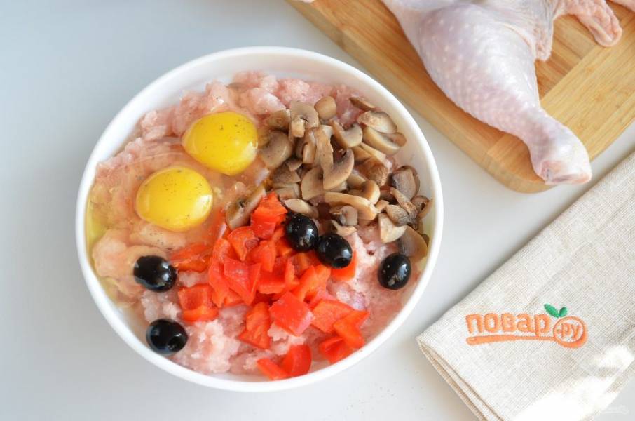 5. Соедините фарш с яйцами, солью, перцем молотым и красным, грибами и маслинами.