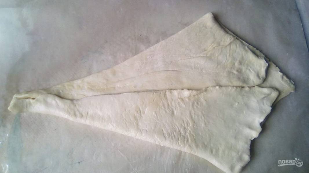 Тесто разморозим. Переложим один из пластов теста на слегка смоченную водой пергаментную бумагу, немного раскатаем тесто скалкой. Нужен пласт квадратной формы. Два края теста завернём к середине, должен получиться ромб, немного придавим его. Это надо для того, чтобы определить границы середины слойки.