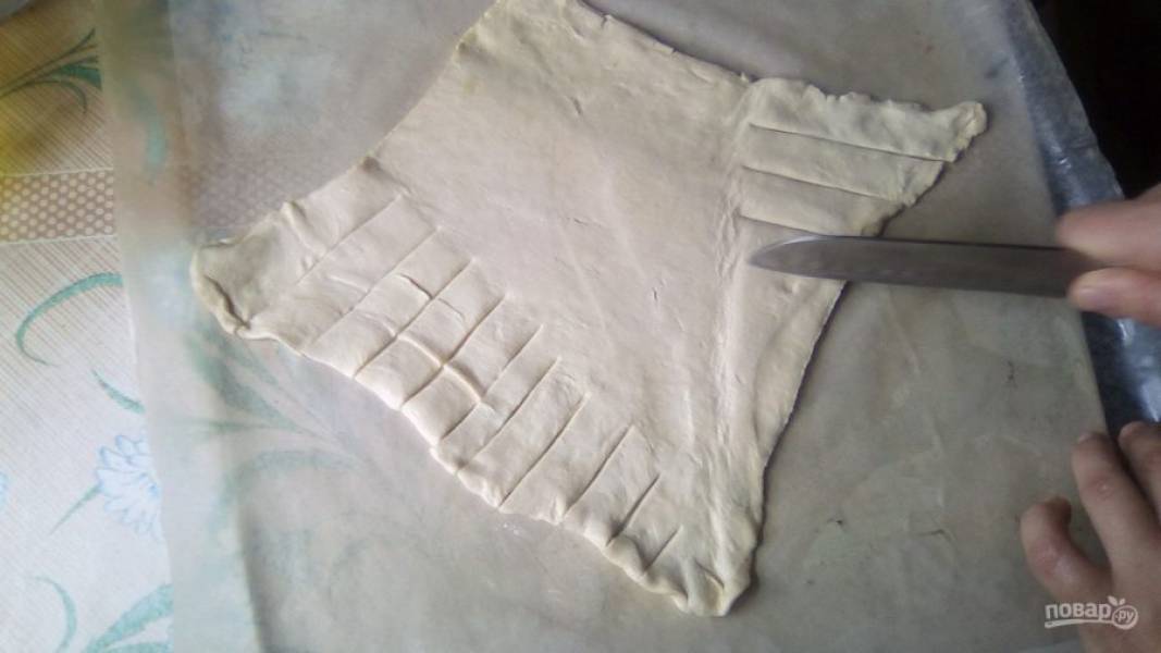 Края теста развернём. Разрежем края на полоски, толщиной около 2 см, как показано на фото.