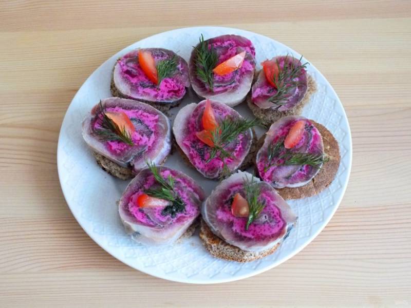 Закончите оформление кусочками помидора и веточками укропа. Оставьте бутерброды при комнатной температуре на 40 минут. После можно подавать на стол.