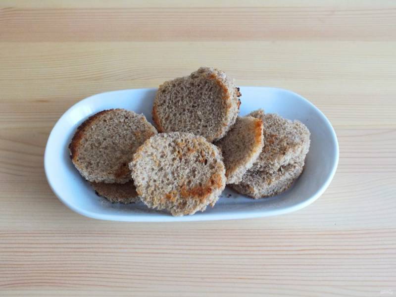 Из ржаного хлеба вырежьте с помощью стакана или вырубки круглые заготовки.