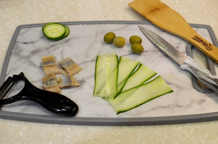 1. Огурец нарежьте с помощью овощечистки на длинные тонкие полоски, сельдь разрежьте на кусочки, подготовьте оливки.