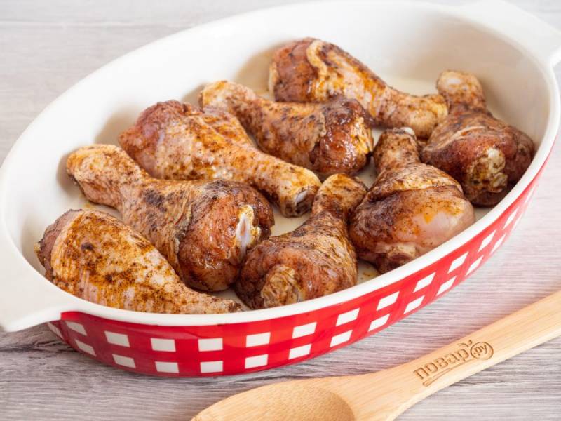 Затем выложите ножки в форму для запекания и отправьте в духовку на 40-50 минут при температуре 190-200 градусов. Всё зависит от размера ножек и особенностей духовки.
