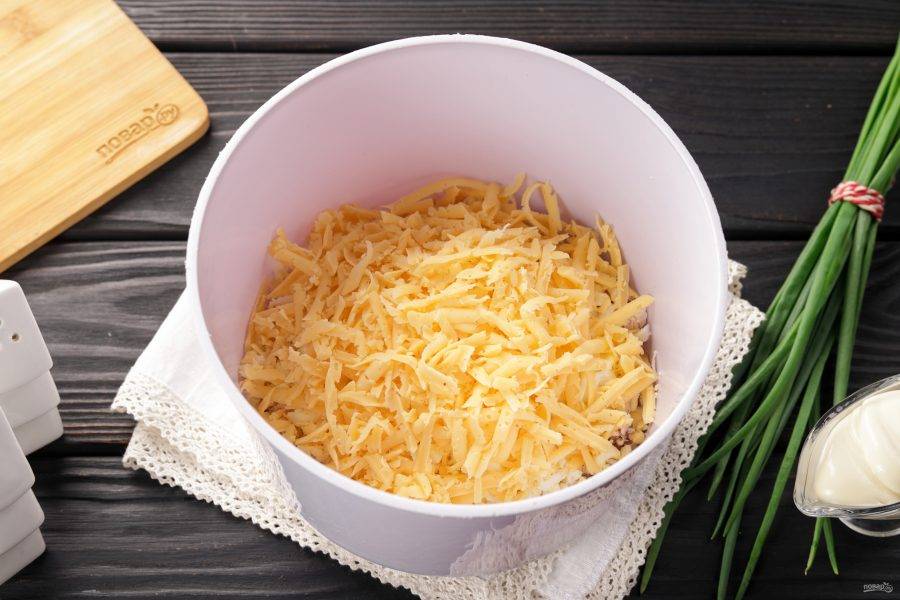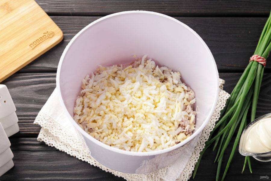 Добавьте тёртые на крупной тёрке варёные яйца.