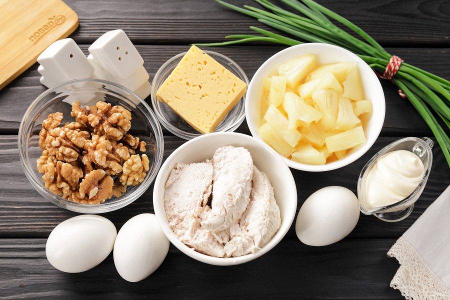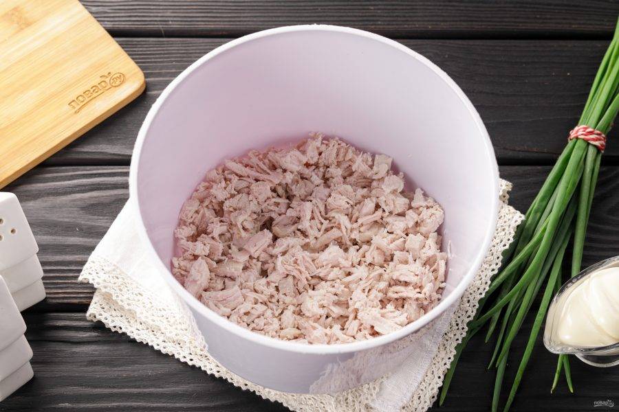 Подготовьте все ингредиенты по списку. Куриное филе отварите в подсоленной воде и оставьте остывать в бульоне. Яйца отварите и так же дайте остыть.
