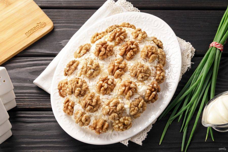 Украсьте салат грецкими орехами и уберите в холодильник до подачи.