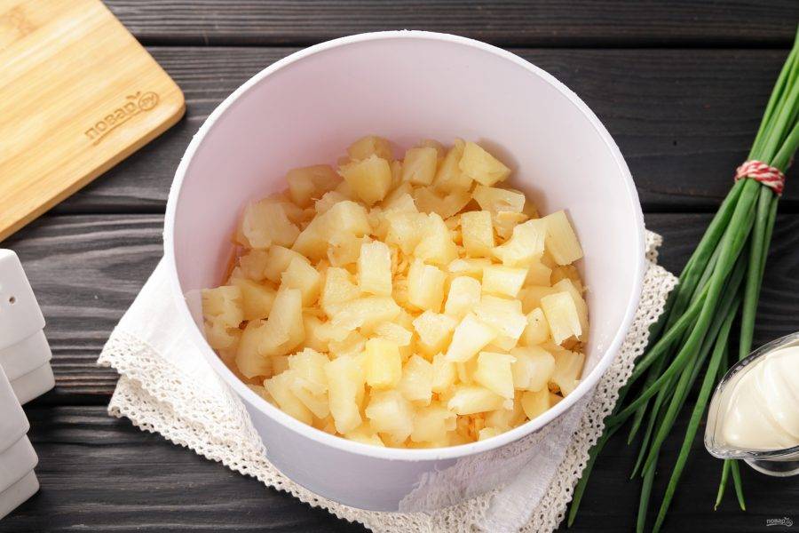 Остывшее куриное филе нарежьте небольшими кусочками и переложите в глубокую миску.
