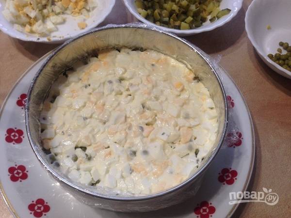 4. Следующий слой— половина нарезанных яиц и горошек, смазываем майонезом. Каждый слой уплотняем, чтобы торт не рассыпался!!