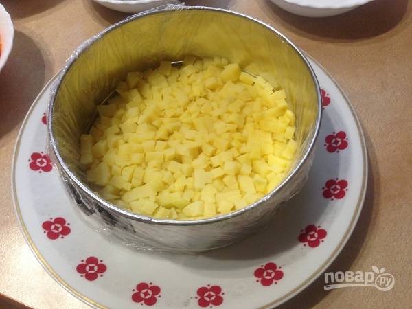 2.Формировать торт-салат будем с помощью съемного кольца с формы для выпечки (обязательно оберните пищевой пленкой!). Первым слоем выкладываем картофель, солим и перчим по вкусу, смазываем майонезом.