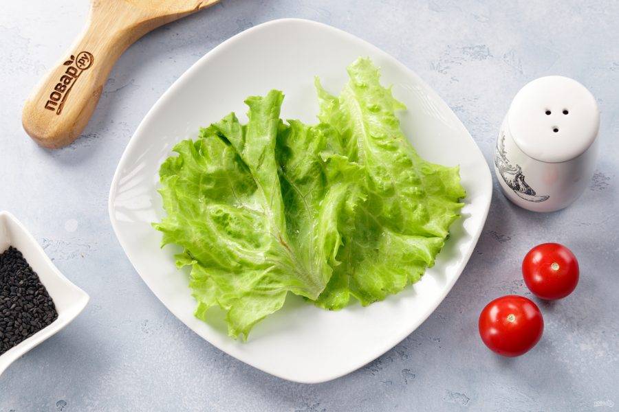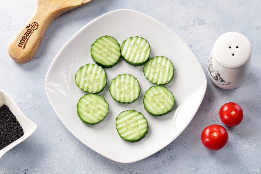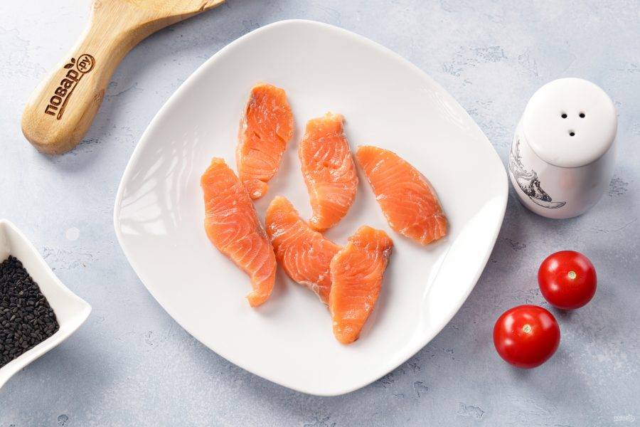 Филе красной рыбы нарежьте тонкими ломтиками, у меня сегодня — слабосолёная форель.