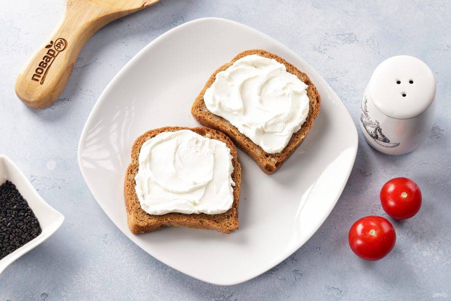 Ломтики хлеба намажьте творожным сыром. Хлеб берите тот, что больше нравится. Предварительно кусочки хлеба можно поджарить или подсушить в тостере.