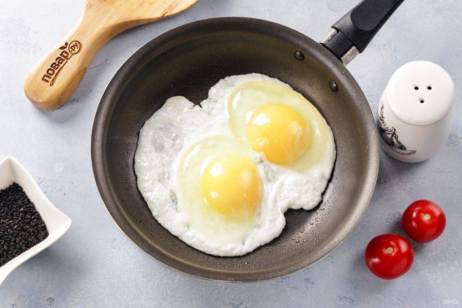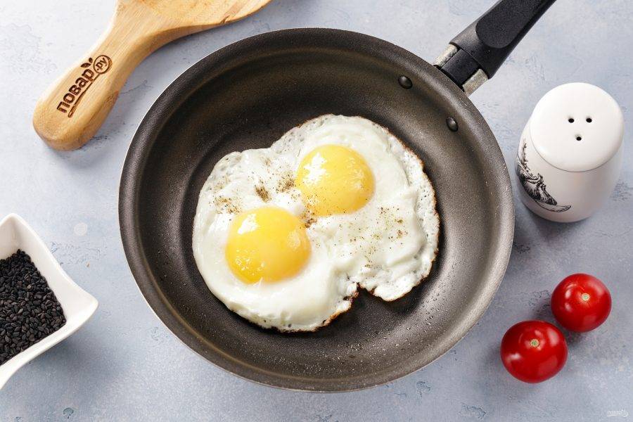 Добавьте соль и специи. Жарьте яйца на небольшом огне, чтобы белок успел приготовиться, а желток остался немного жидким.