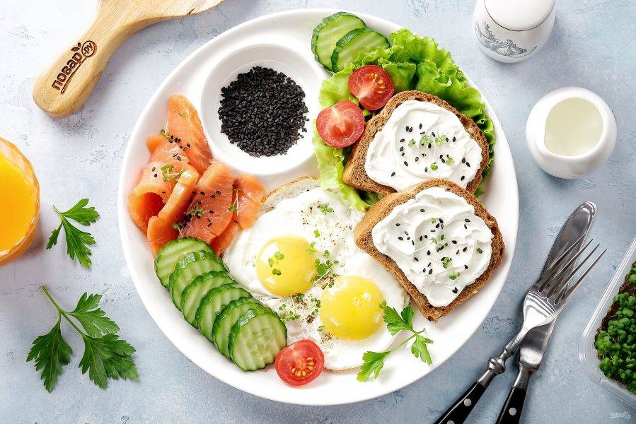 На большую плоскую тарелку выложите листья салата, кусочки хлеба с нежным творожным сыром, жареные яйца, нарезанные огурцы и ломтики красной рыбы. Помидоры черри можно добавить целиком или разрезать их пополам. Перед подачей добавьте кунжут и любую свежую зелень. Праздничный завтрак готов. Приятного аппетита!