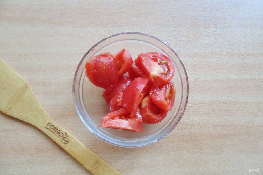 Помидоры помойте, удалите места соединения с плодоножкой. С противоположной стороны сделайте крестообразный надрез. Выложите помидоры в кипящую воду на 30 секунд, затем опустите в холодную. Снимите кожицу и нарежьте помидоры.