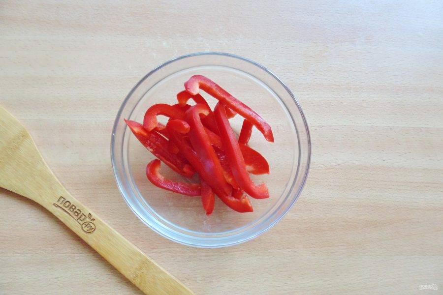 Болгарский перец очистите от семян, помойте и нарежьте произвольно.