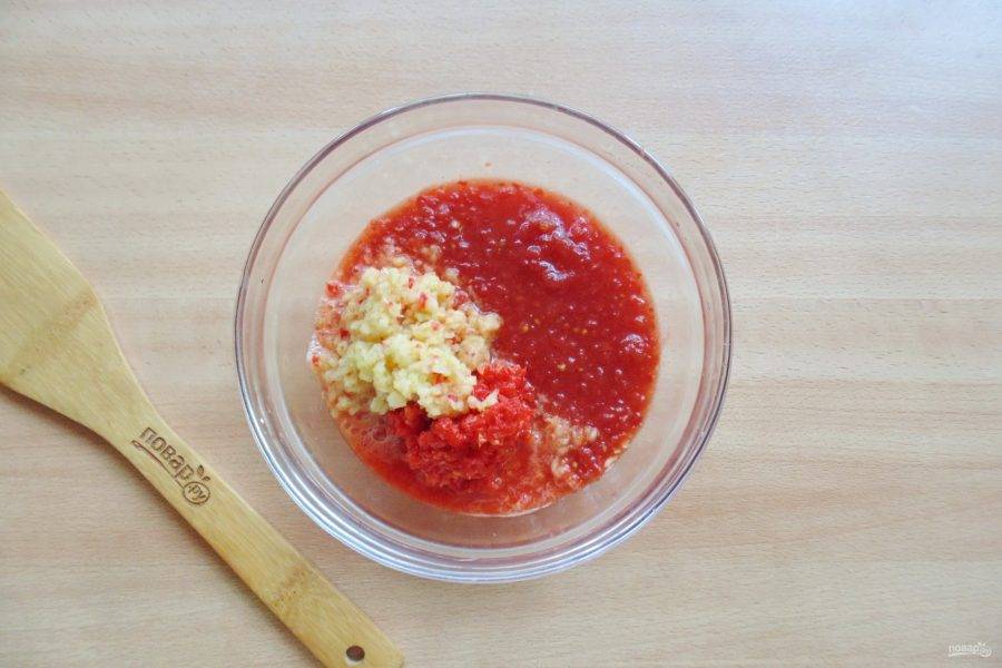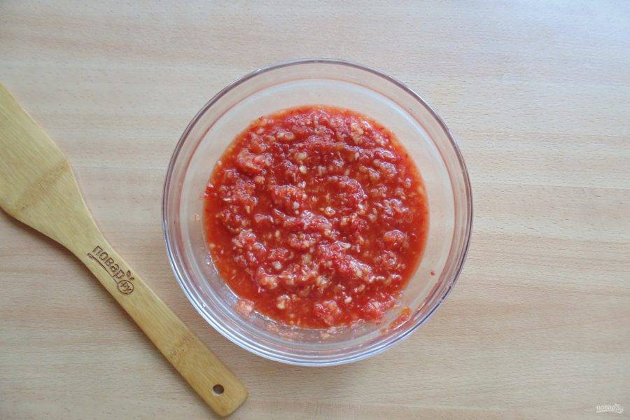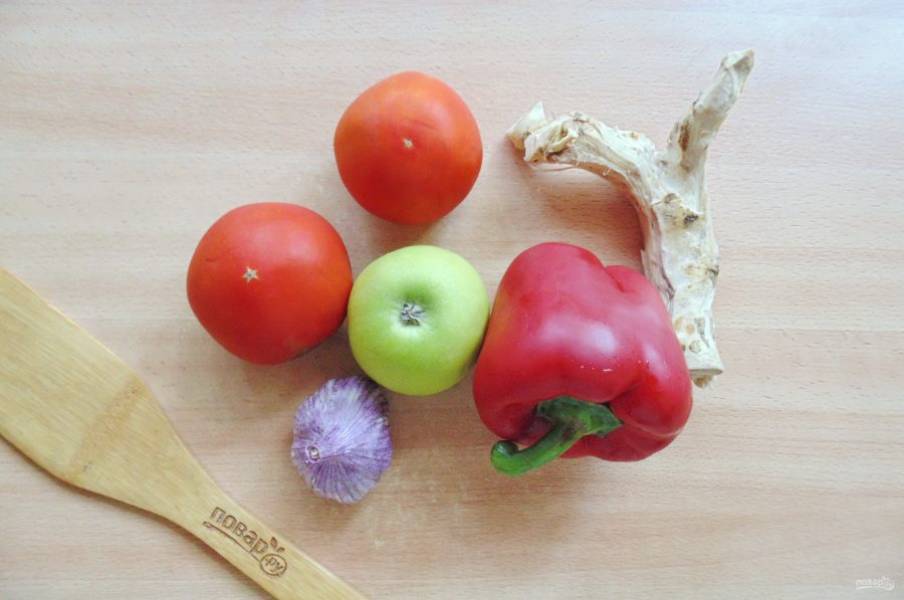 Пропустите через мясорубку чеснок, болгарский перец, корень хрена, яблоко и помидоры.