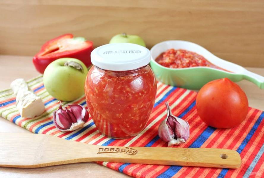 "Гюрза" — острый томатный соус с хреном и чесноком. Само название говорит об этом. Яблоки немного смягчают вкус. Любители острых приправ её оценят. Подавайте к мясу, рыбе, птице, первым блюдам.