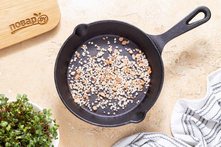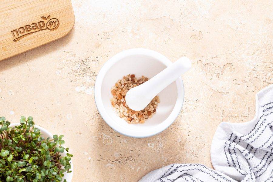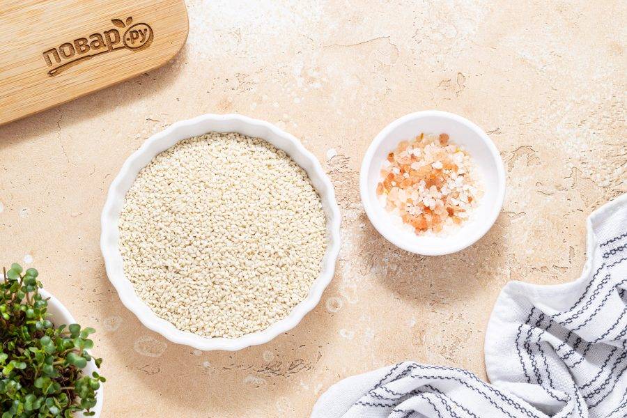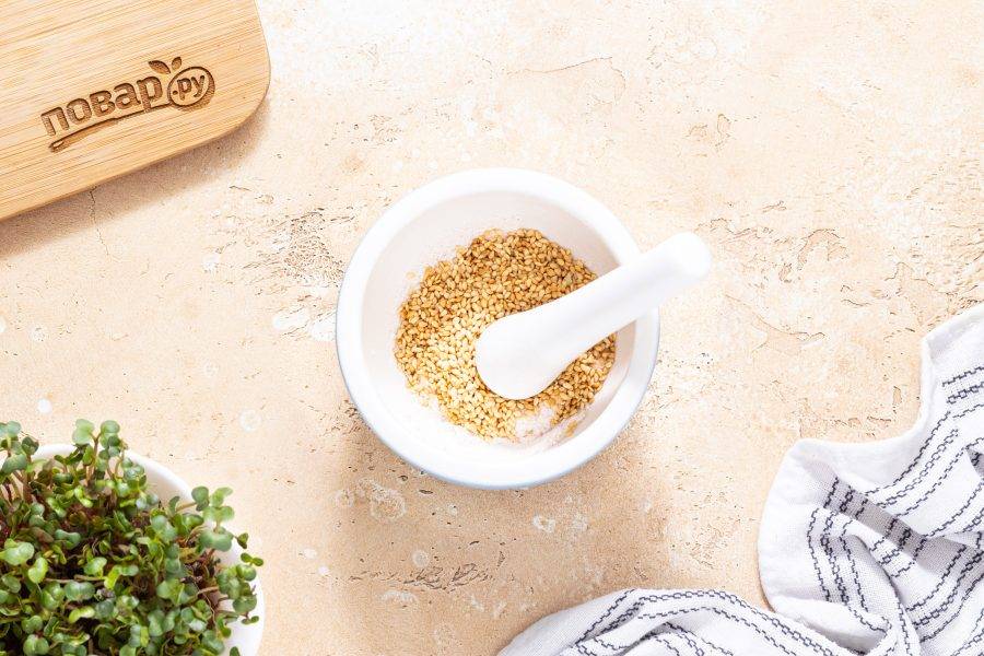 Порционно начните выкладывать кунжут в ступку с солью и измельчать. Проще это делать, пока кунжут еще теплый.