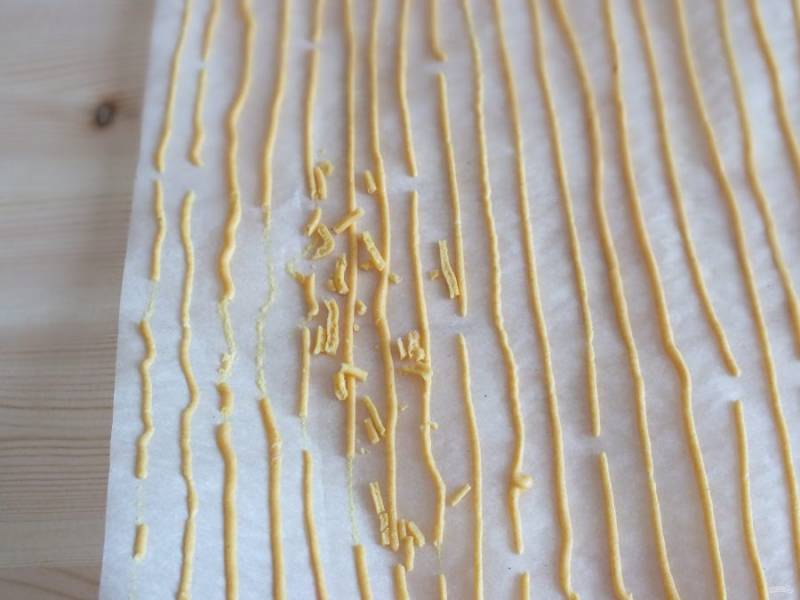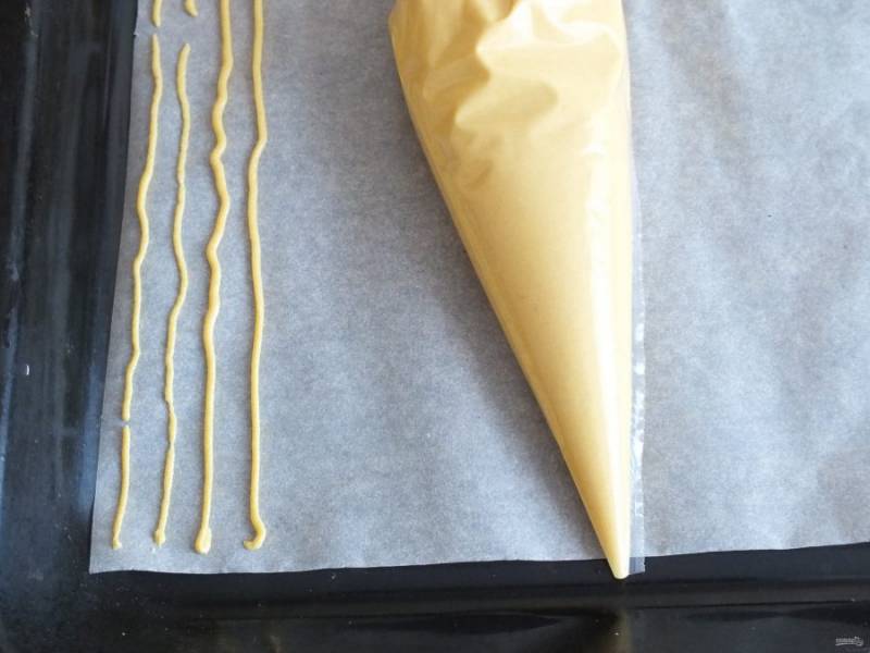 Подготовьте противень с пергаментной бумагой. На листе проведите тонкие линии. Заполните желаемое количество листов.