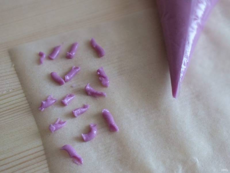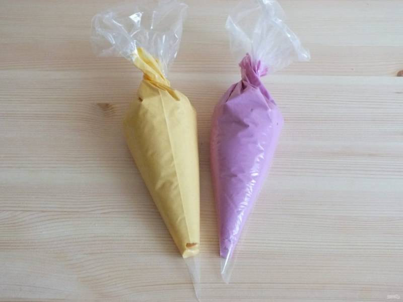 Возьмите кондитерские мешки и заполните полученной массой. Отрежьте кончик у мешка, отверстие должно быть минимальным.