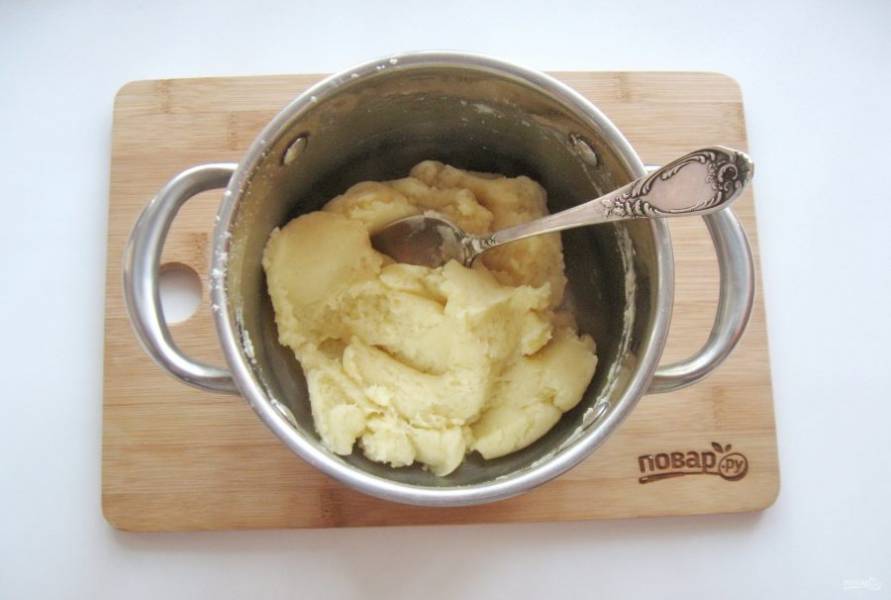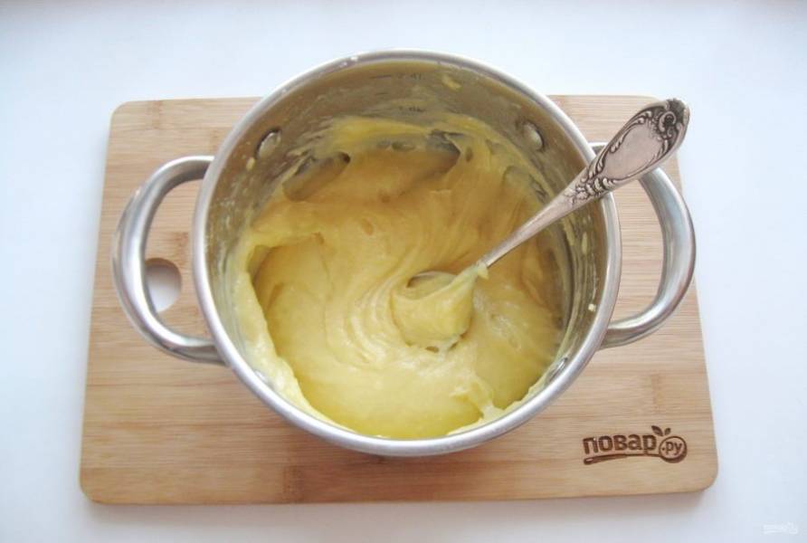 Когда масло полностью растворится в горячей воде, всыпьте стакан муки. Постоянно перемешивайте, пока тесто не скатается в шар и начнет отставать от стенок кастрюли.