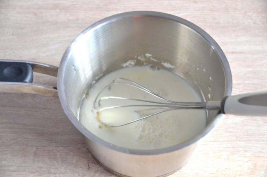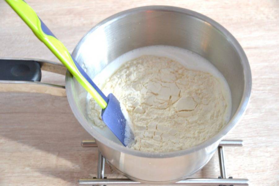 Влейте в сотейник полстакана молока, размешайте до однородности, влейте оставшееся молоко, т.е. еще полстакана, поставьте на средний огонь при постоянном помешивании.