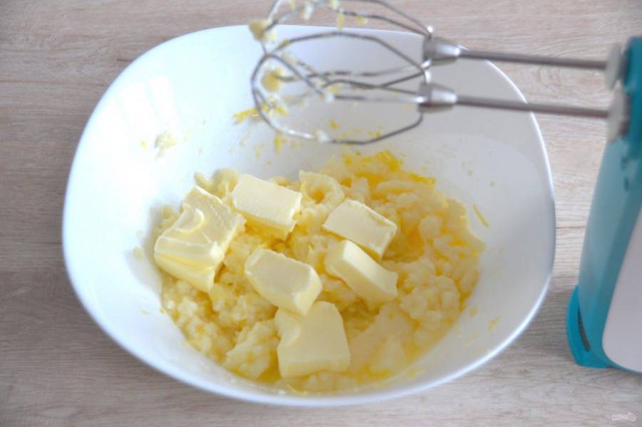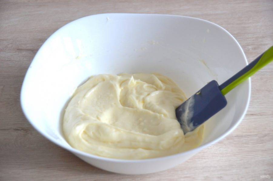 Добавьте мягкое сливочное масло комнатной температуры. Это обязательное условие, крем и масло должны быть одинаковой комнатной температуры, так крем получится правильной текстуры. Взбейте кремовую массу миксером.