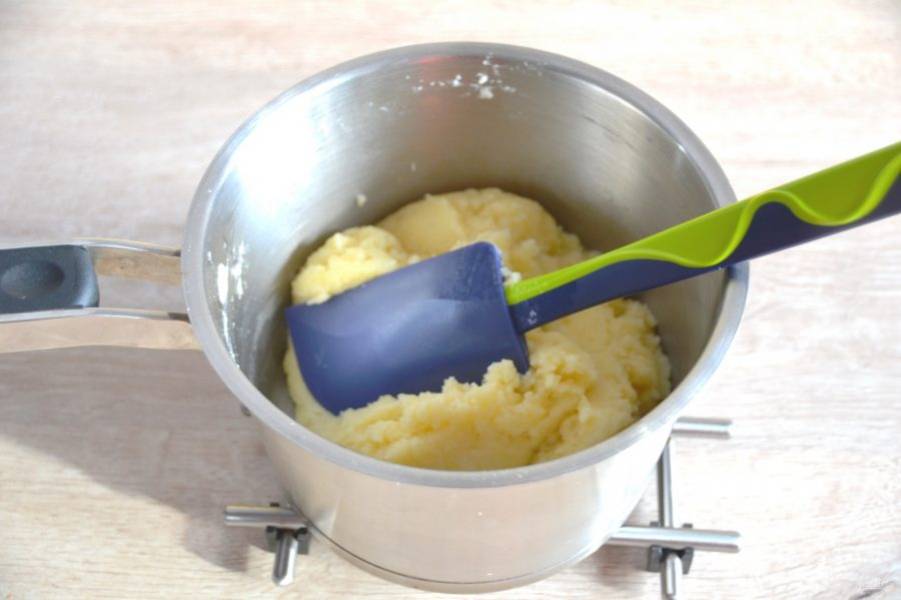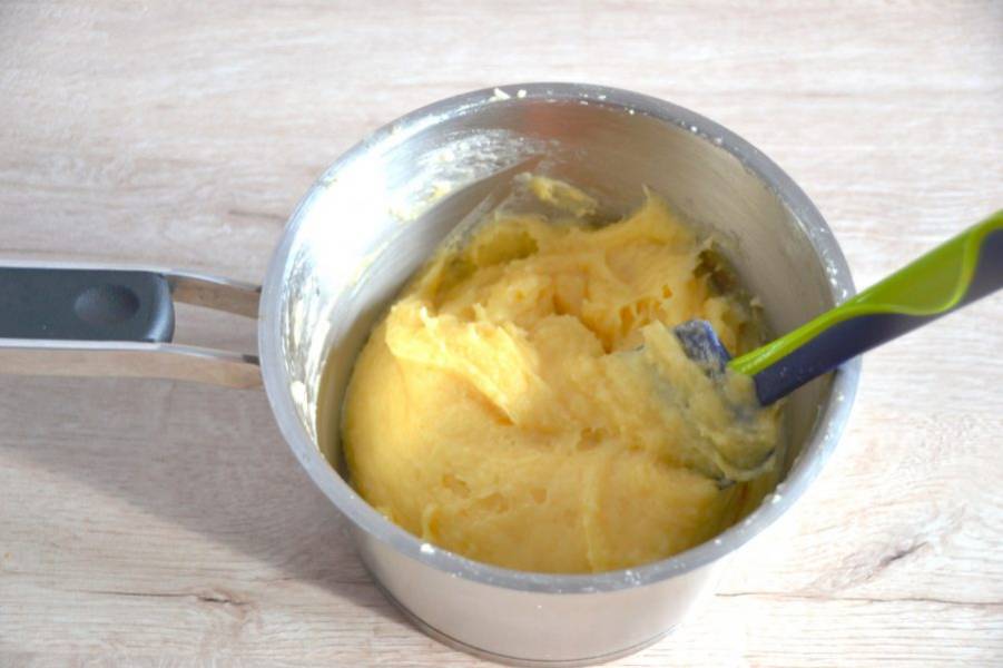 Как только тесто соберется в комок и начнет отставать от стенок сотейника снимите с огня. Немного охладите.