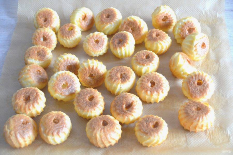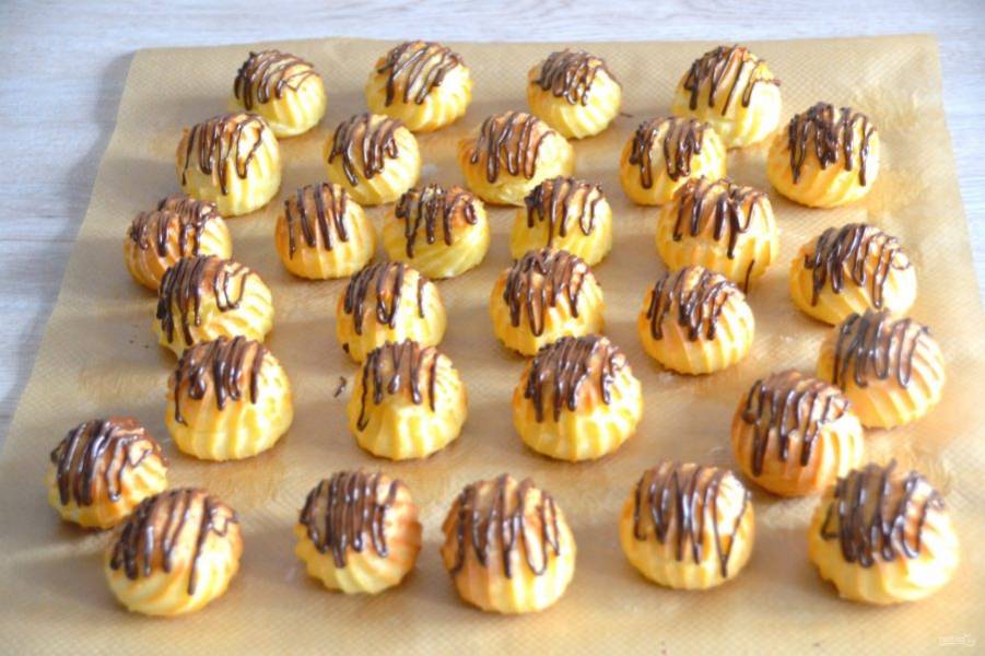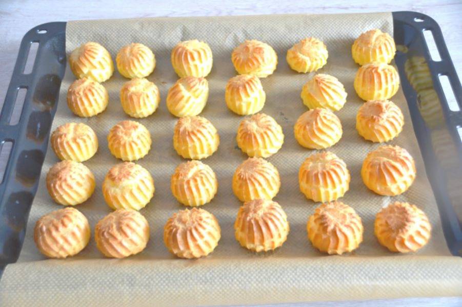 Выпекайте профитроли при температуре 190 градусов 30-35 минут, затем понизьте температуру до 160 градусов и выпекайте еще 10 минут. Готовые профитроли не торопитесь сразу доставать из духовки, приоткройте дверцу и подержите их в духовке примерно 10 минут.
