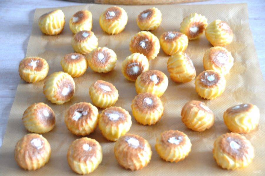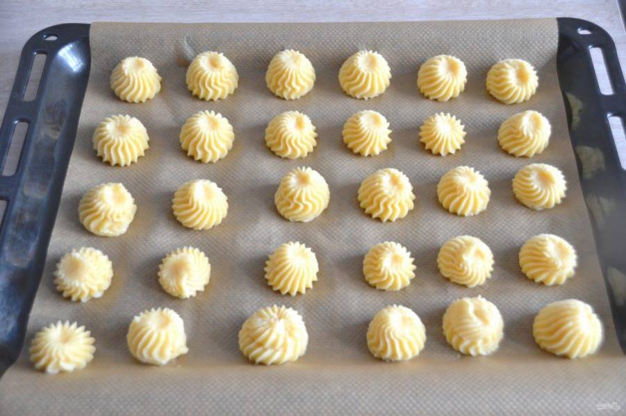 Отсадите профитроли на лист для выпечки на некотором расстоянии друг от друга. Пальцем пригладьте кончики теста, которые образуются при отсаживании.