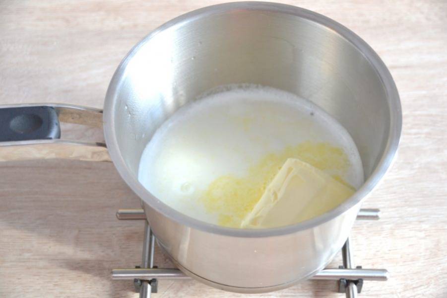 Для приготовления теста влейте в сотейник 125 мл. молока, 125 мл. воды, добавьте щепотку соли, нагрейте. В разогретую смесь выложите сливочное масло до растворения.