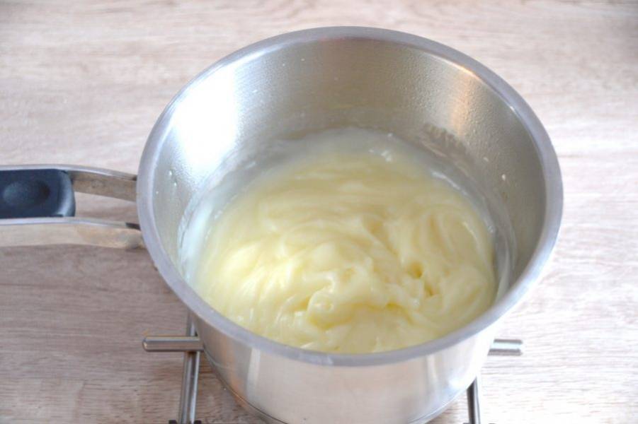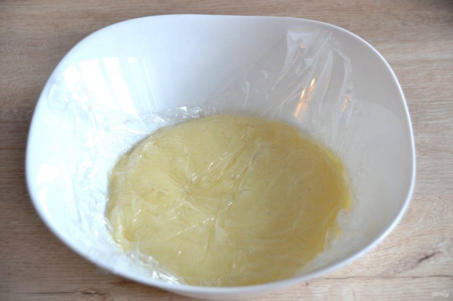 Накройте крем пищевой пленкой стык в стык, охладите до комнатной температуры.