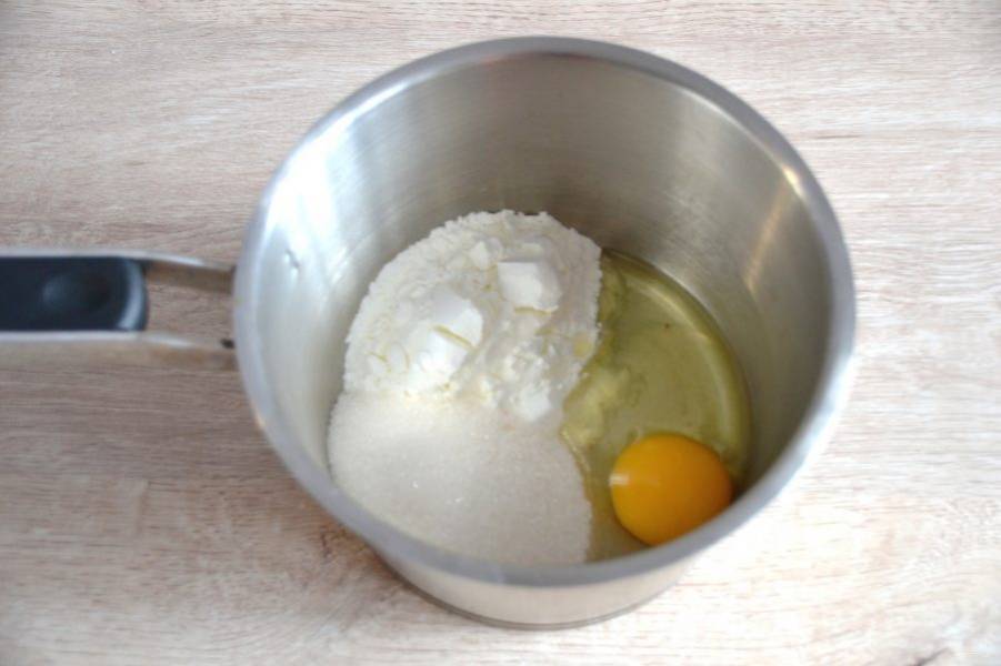 Начните приготовление профитролей с приготовления крема. Для этого выложите в сотейник яйцо, крахмал, сахар.
