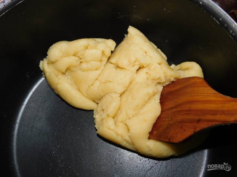 В кипящую массу всыпьте муку и быстро все перемешайте, чтобы мука хорошо заварилась. Тесто остудите до комнатной температуры.