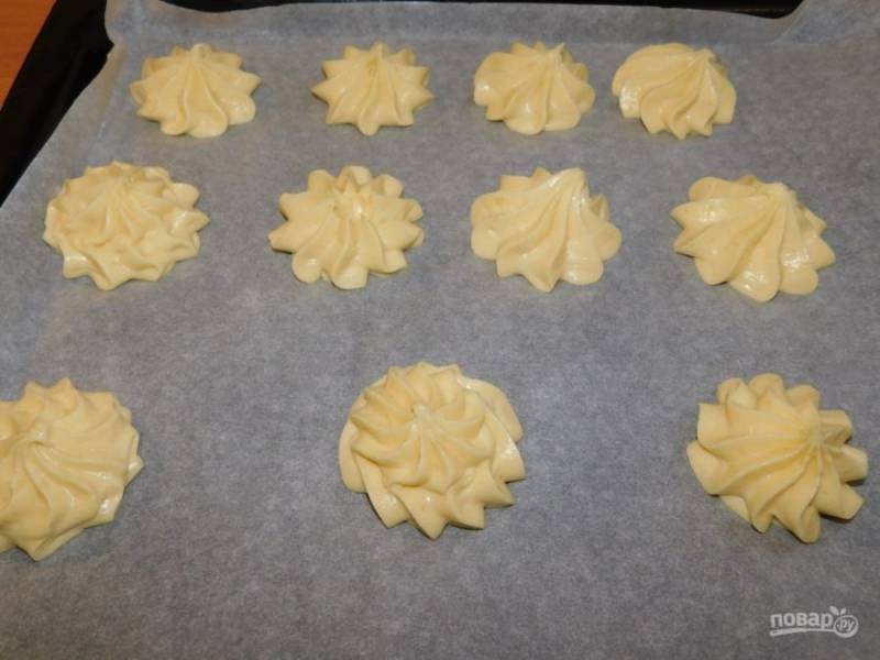 Затем введите по одному все яйца, чтобы тесто получилось эластичным. На противень для выпечки отсадите с помощью кондитерского мешка небольшие профитроли. Поставьте в духовку, разогретую до 200 градусов, на 30 минут.
