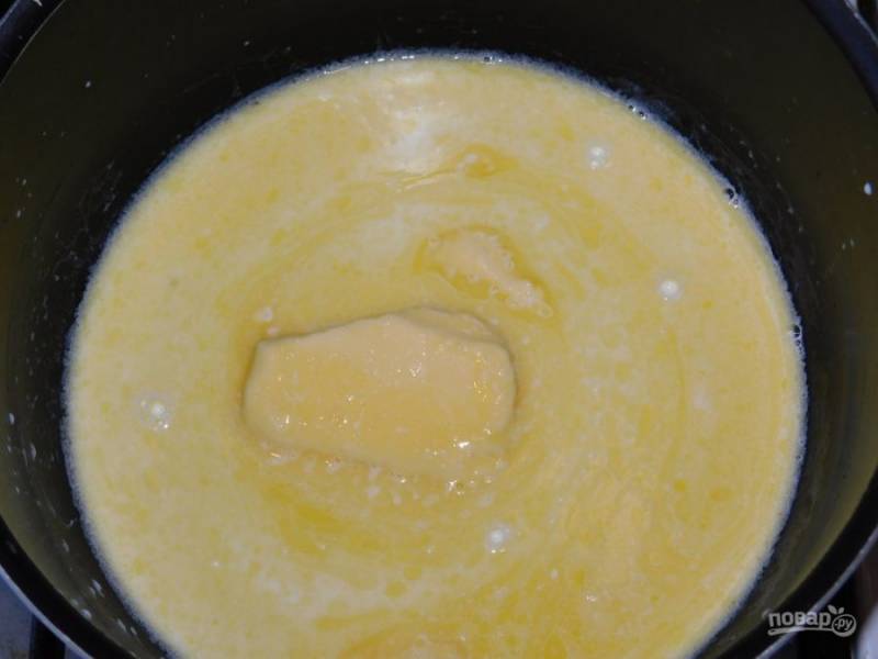 Для приготовления заварного теста соедините воду, молоко и сливочное масло. Доведите до кипения.