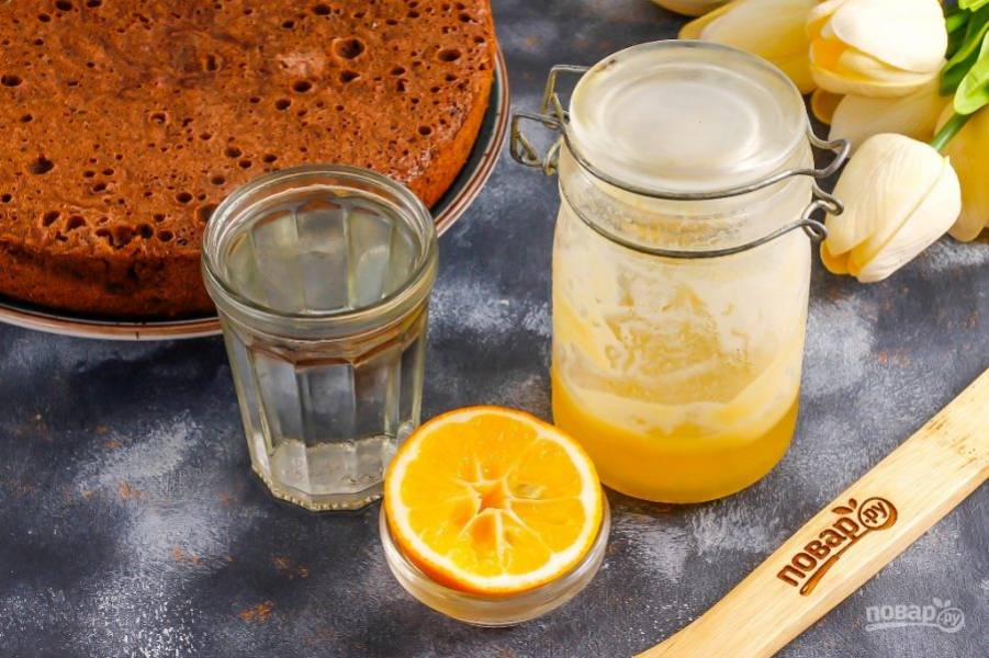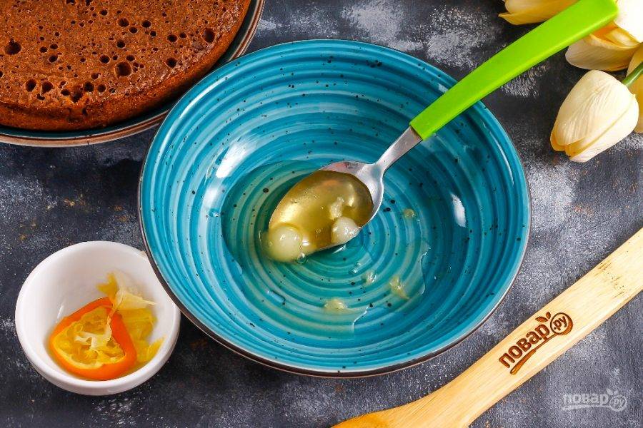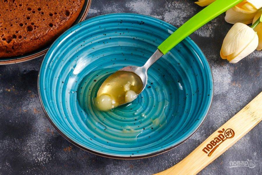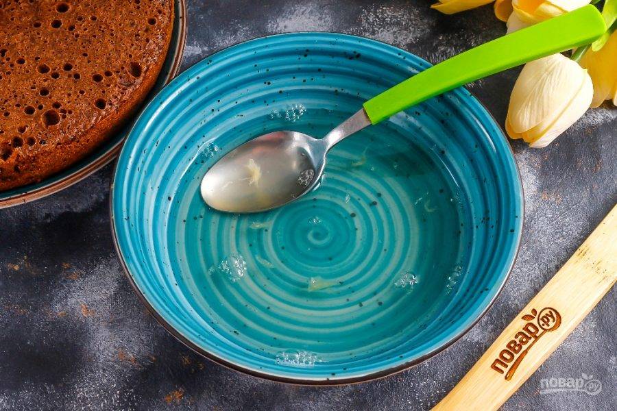 Перелейте пропитку в стакан или чашку. С помощью чайной или столовой ложки пропитайте коржи, выложив их на блюдо. Помните, что после пропитывания переместить корж вы уже не сможете, так как он будет ломаться.