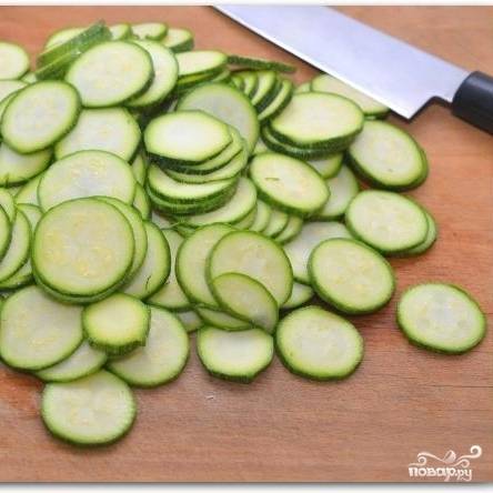 Итак, начинаем. Цуккини острым ножом нарезаем на тонкие ломтики.
