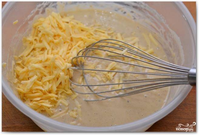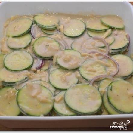 В получившееся тесто добавляем лук и цуккини. Аккуратно перемешиваем, чтобы овощи хорошо схватились с тестом.