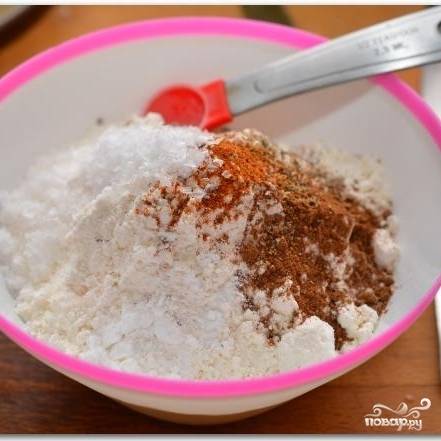 Отдельно смешиваем сыпучие ингредиенты: муку, соль и перец. При желании можно добавить любые другие специи - какие вам больше нравятся.