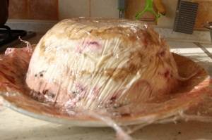 миску с тортиком ставим в холодильник на ночь, а утром достаем, переворачиваем на тарелку и снимаем пленку)