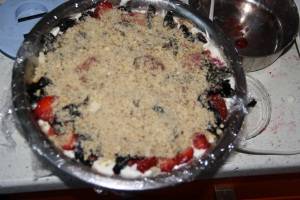 берем миску и выкладываем ее пищевой пленкой. и начинаем выкладывать в миску слоями торт. Первый слой- печенье, далее- сметана, фрукты, сметана, орехи, сметана, печенье, и так далее, пока не закончатся "слои". Последний слой- печенье.