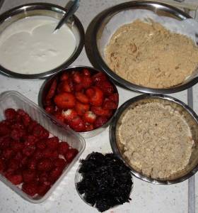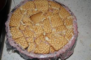и еще 2 момента- выкладываем малину, перемешанную со сметаной, а сверху кусочки печенья- это "финальный" корж)