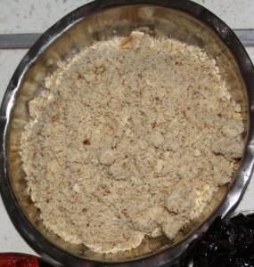 на фото выше помимо коричневого сахара- сахарная пудра с ванилью. Я для вкуса добавила, но это на любителя) следующий шаг- измельчаем орехи. Вместе, в бленденре. До мелкой крошки.