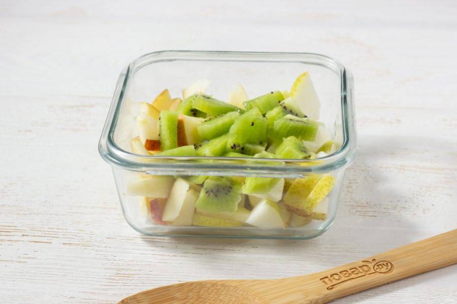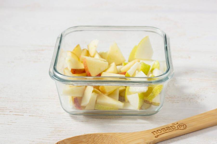 Яблоко и грушу очистите от сердцевины, нарежьте небольшими кусочками и выложите в салатник.